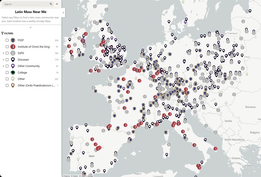 Eine Besonderheit der Karte besteht darin, daß sie die Meßorte in acht den jeweiligen Trägern entsprechende Hauptkategorien eingeteilt hat, die man sich auf Mausklick auch einzeln anzeigen lassen kann. Die Kategorie „verschiedene“ ist mit 267 Eintragungen bestückt, bei denen es zum Teil keinen Verweis auf Webseiten oder sonstige Zusatzinformationen gibt. Darunter dürften sich auch einige „unabhängige“ Garagenkapellen befinden, deren Besuch unter Umständen problematisch ist. Aber alles in Allem: um die 2000 Sonntagsmessen im überlieferten Ritus – das ist keine schlechte Hausnummer.