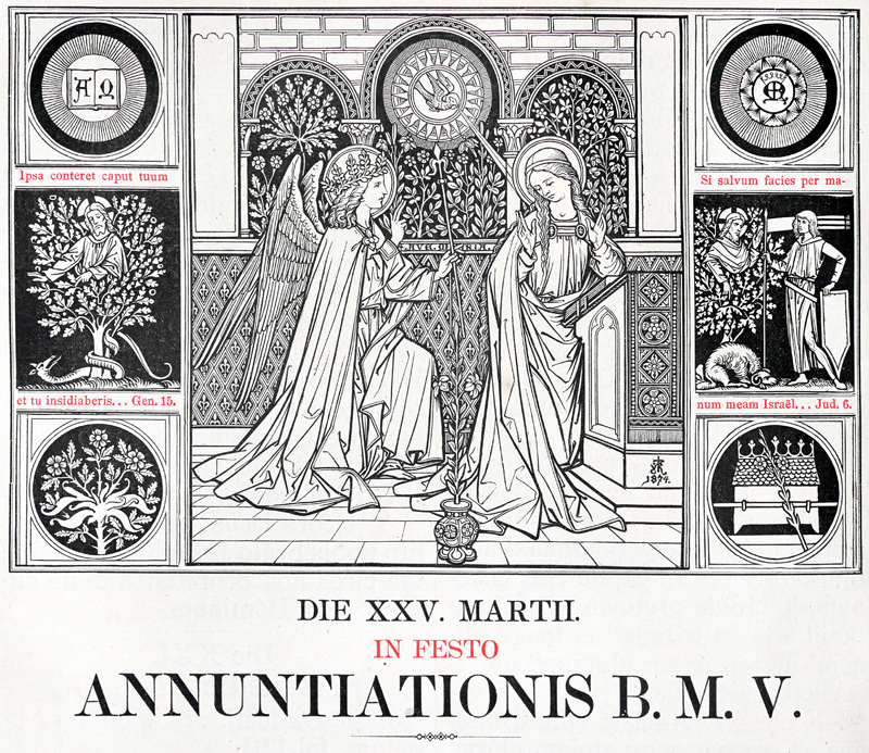 Das Fest der Verkündigung Mariens ist im Pustet-Missale von 1884 mit einer „typologischen“ Illustration hervorgehoben. Das Bild stammt nach der für uns bislang unlesbaren Signatur noch nicht von Max Schmalzl, der erst ab 1883 regelmäßig für Pustet arbeitete. Möglicherweise geht es auf seinen Vorgänger Johannes Evangelista Klein, zurück, der schon seit 1875 die Illustrationen für Pustet betreute und bereits seit diesem Jahr mit einigen eigenen Arbeiten im Missale vertreten war – Bildern, die wahrscheinlich schon in den Vorjahren entstanden waren und an theologishem Gehalt meist nicht an die späteren Vignetten Schmalzls heranreichen.