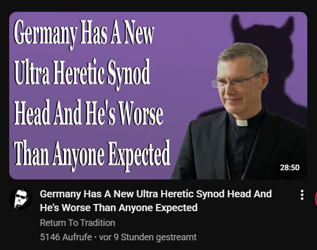 fällt uns weiter nichts ein - das Vorschaubild des Kommentars von Anthony Stine auf Youtube sagt alles, und wer sich das (englischsprachige) Video antun will, findet es hier. Der Ton ist amerikanisch hart - aber wer wollte Stine in der Sache widersprechen? Wir selbst folgen jedenfalls dem (so sieht es zumindest bisher aus) Vorbild anderer deutscher traditionsfreundlicher Webseiten und zerbrechen uns über Zentralkomitee, Bischofskonfereenz und andere Monstrositätem nicht weiter den Kopf. Sollen die Toten ihre Toten begraben.