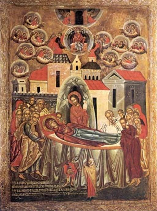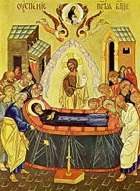 Danach pilgerten die Apostel in verschiedene Länder, um das Wort Gottes zu predigen. Später beendete die heilige Maria den Lauf dieses Lebens und wurde aus der Welt abberufen und alle Apostel hatten sich aus allen Himmelsrichtungen in ihrem Haus zusammen eingefunden. Als sie hörten, dass sie von der Welt genommen werden sollte, hielten sie Wache bei ihr. Auf einmal kam ihr Herr mit den Engeln, nahm ihre Seele, übergab sie an Michael, den Erzengel, und verschwand. Jedoch bei Tagesanbruch hoben die Apostel den Leib zusammen mit dem Sterbebett empor, stellten es in ein Grab und hielten Wache darüber in Bereitschaft für das Kommen des Herrn. Und wiederum stand auf einmal der Herr bei ihnen und ordnete an, dass der heilige Leib aufgenommen und auf einer Wolke zum Paradies geführt wird. Wiedervereint mit der Seele freut er sich dort mit seinen Auserwählten und findet Gefallen an den Gnaden der Ewigkeit, die niemals aufhören werden.15 Das Fest der Entschlafung begann im Osten im sechsten Jahrhundert. Die älteste existierende Homilie scheint die des Johannes von Thessaloniki (gest. 630) zu sein, als er das Fest in seiner Diözese einführte. Interessanterweise bezeugt Johannes den weit verbreiteten Glauben an die Aufnahme in den Himmel sowie seinen Glauben an die Authentizität der Transitus Mariae Geschichten, aber auch die Tatsache, dass diese Erzählungen angefochten wurden. Einige Personen verpflichteten sich zur Niederschrift der wunderbaren Dinge, die zu dieser Zeit nach deren Überzeugung geschahen. Praktisch feiert jeder Ort unter der Sonne mit Ausnahme von ein paar wenigen, darunter auch das Gebiet um diese von Gott geschützte Stadt Thessaloniki, jedes Jahr das Gedächtnis, des sich zur Ruhebegebens Mariens. Warum ist dies so? Sollen wir den Leichtsinn oder die Trägheit jener anklagen, die vor uns gegangen sind? Gewiss dürfen wir nicht etwas derartiges sagen oder sogar denken, weil sie und sonst niemand uns dieses ausgezeichnete Prinzip als eine Art Gesetz für unser Heimatland zurück ließen: dass wir nicht nur das Gedächtnis unserer heimatlichen Heiligen feiern, sondern von allen, die für Christus überall auf der Welt gekämpft haben, so dass wir bei diesen fürbittenden Zusammenkünften näher zu Gott wachsen können. Dann waren unsere Vorfahren weder achtlos noch träge; obwohl doch jene, die damals beim Tode Marias gegenwärtig waren, ihr Ende wahrheitsgemäß beschrieben haben, haben wir erfahren, dass böswillige Häretiker später ihre Berichte verdorben haben, indem sie eigene Texte hinzugefügt haben; aus diesem Grund distanzierten sich unsere Vorfahren von diesen Erzählungen, da sie nicht im Einklang mit der katholischen Kirche standen. Aus diesem Grund geriet das Fest (ihrer Entschlafung) unter ihnen in Vergessenheit... Wir haben selbst keine geringe Anstrengung gescheut, um eure frommen Ohren - um eure Seelen zu erwecken und aufzubauen; nicht alles, was wir schriftlich auf verschiedene Weise und in verschiedenen Büchern über dieses Ereignis gefunden haben, sondern nur, was wirklich geschah, woran man sich erinnert, dass es stattgefunden hat, und das bis heute durch die Existenz von aktuellen Stätten bezeugt ist.16 Im Jahre 1955 wurde im Katharinenkloster auf Berg Sinai ein schwer beschädigtes Manuskript einer Homilie von Bischof Theoteknos aus Livas in Palästina, entdeckt. Diese Homilie aus der ersten Hälfte des siebten Jahrhunderts bezeugt die Kenntnis einer palästinischen Kirche über das Ende Marias: „Die Aufnahme des Leibes der Heiligen und ihr Aufstieg in den Himmel fand am 15. August statt, welches der 6. Tag des Monates Mesore ist. Und es herrschte Freude im Himmel und auf Erden, als die Engel den Lobgesang anstimmten, indes die Menschen die Mutter des Königs des Himmels verherrlichten, die Mutter Gottes, die selbst das Menschengeschlecht verherrlicht hatte...“ 17 Theoteknos besteht darauf: „Dies ist die Frucht, die unsere Erde hervorgebracht hat: die immer-währende Jungfrau, die Mutter Gottes. Während sie auf Erden lebte, behütete sie uns alle und hegte eine Art universeller Fürsorge für ihre Untergebenen. Nun, da sie in den Himmel aufgenommen worden ist, ist sie eine unangreifbare Feste für das Menschengeschlecht und sie hält Fürsprache für uns bei Gott, dem Sohn.“18 In den Homilien der östlichen Väter können wir eine theologische Würdigung des Geheimnisses feststellen. So verbindet der heilige Germanus, der Patriarch von Konstantinopel (gest. ca. 733), die Aufnahme Marias in den Himmel mit der Menschwerdung Christi: Du hattest einen Leib genau wie einer von uns, und deshalb konntest du nicht dem Geschehen des Todes entkommen, welches das gemeinsame Schicksal aller Menschen ist. Auf die gleiche Weise hat selbst dein Sohn den Tod erlitten (Hebräer 2,9), obgleich er Gott ist. Gewiss hat er Wunder sowohl in seinem eigenen lebenspendenden Grab als auch in der lebenspendenden Grabkammer, wo du zur Ruhe gelegt worden bist, gewirkt: beide Gräber nahmen wahrhaftig Leiber auf, doch keiner von ihnen war eine Stätte der Verwesung. Denn es war ausgeschlossen, dass du, das Gefäß, das Gott geboren hat, in den Staub des Todes aufgelöst und verwest sein solltest. Weil er, der sich in dich ergoss, Gott und ewiges Leben von Anfang an war, musste die Mutter des Lebens seine Gefährtin werden und musste den Tod bloß als ein Einschlafen erfahren; du hast deinen Übergang von dieser Welt als ein Erwachen zu deiner eigenen Wirklichkeit erleben müssen, du Urheber des Lebens.Der Erzbischof von Kreta Andreas (gest. 740), sieht Maria als ein Vorbild unserer Neuwerdung: Die Natur selbst ist aus der Verdammung der Verderbnis geweckt worden, hat einen neuen Zustand angenommen, der in Unverderblichkeit verwurzelt ist. Was für eine Umwandlung! Welche Neuheit! Welch göttlicher Tausch! Die Natur brachte einen Weinstock hervor, der Dornen brachte (Jes 5, 1-7), aber sie hat im Gegensatz einen hervorgebracht, der den Willen seines Vaters erfüll
