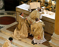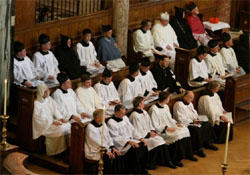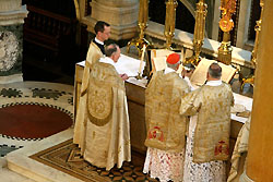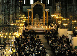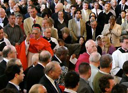 Während der Chor das Sanctus und Benedictus von Palästrina sangen, wurde schweigend der römische Kanon gebetet. Nach der Antiphion zur Communio wurde das Ave Verum Corpus von Byrd gesungen, und die ganze Gemeinde schloß sich mit dem Gesang des Hymnus Adoro te devote an. Zur Kommunionspendung, die mindestens 15 Minuten dauerte, hatte man Kniebänke vor dem Altarraum und im Mittelschiff der Kathedrale aufgestellt. Zum Auszug von Chor, Klerikern und Altardienst erklang auf der gewaltigen Hauptorgel Widors „Marche Pontificale“.